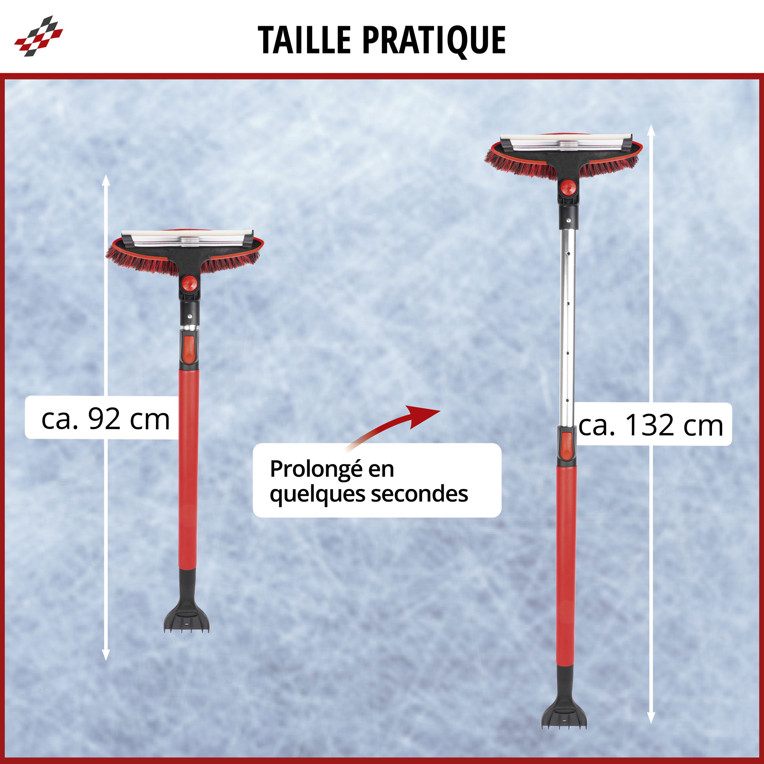 Ce produit est fabriqué dans un matériau de haute qualité et robuste. D'un côté, il comporte un grattoir à glace avec des griffes brise-glace qui permettent d'éliminer rapidement la glace. De l'autre côté du produit se trouve une brosse avec des poils résistants de différentes longueurs, grâce à laquelle vous pourrez rapidement libérer votre voiture de la neige poudreuse accumulée. Cette brosse peut pivoter à 270° et peut être bloquée à 90°, 180° et 270°. De plus, sa poignée est agréablement rembourrée et télescopique. Selon l'utilisation, la poignée peut être ajustée à une longueur comprise entre 92 et 132 cm. Ainsi, toutes les vitres de votre voiture sont facilement accessibles et le grattage laborieux de la glace dans des endroits inaccessibles au milieu du pare-brise est désormais relégué au passé.