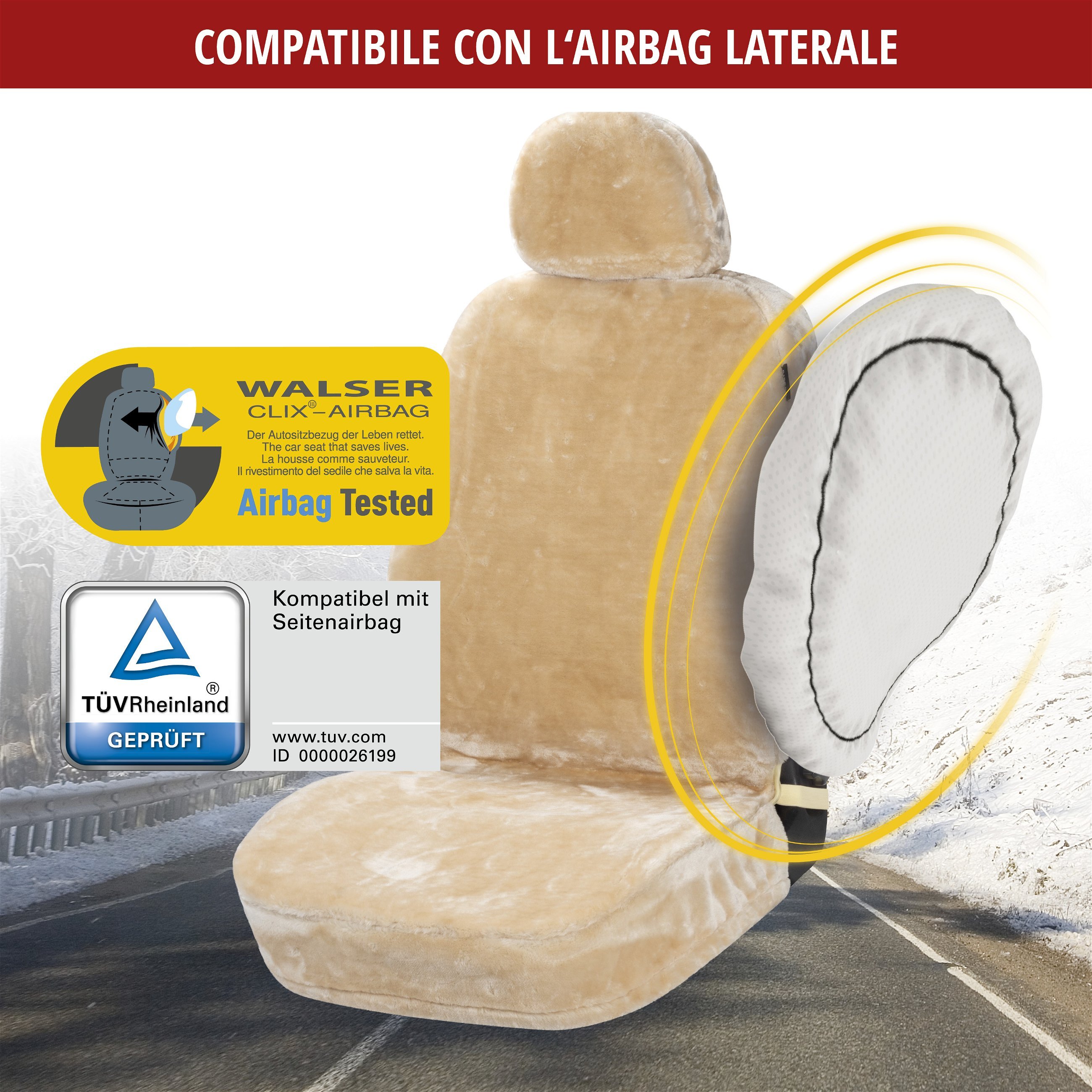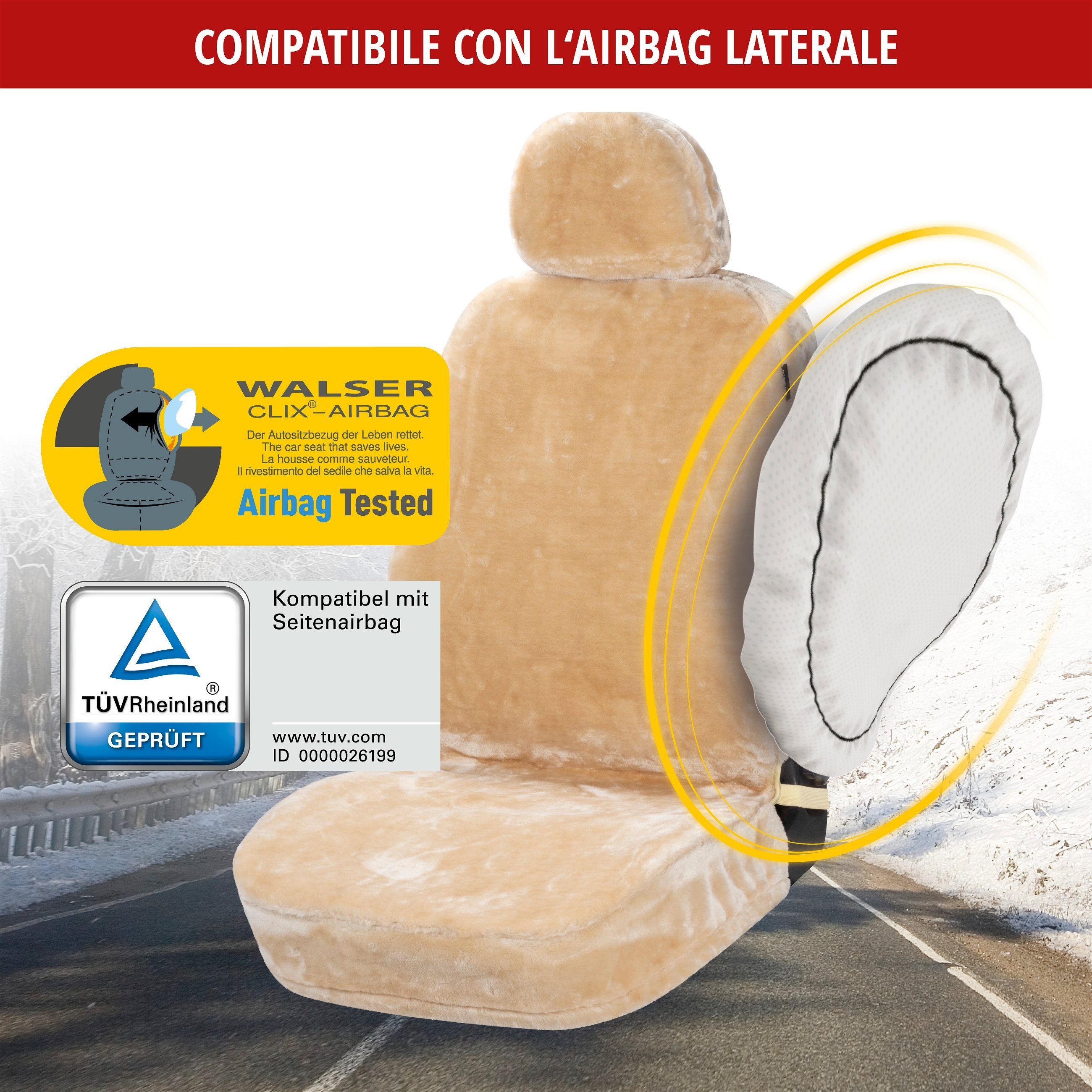 La seduta e lo schienale sono realizzati in pelliccia sintetica molto soffice, che invita proprio a soffermarsi per farsi coccolare. Il coprisedile nel colore beige convince non solo per l'elevato comfort di seduta durante ogni viaggio, ma anche per la sua grande sicurezza, perché il prodotto è certificato CLIX III. Il coprisedile è quindi adatto a tutti i veicoli con airbag laterale integrato e consente all'airbag laterale di aprirsi senza impedimenti in caso di emergenza.