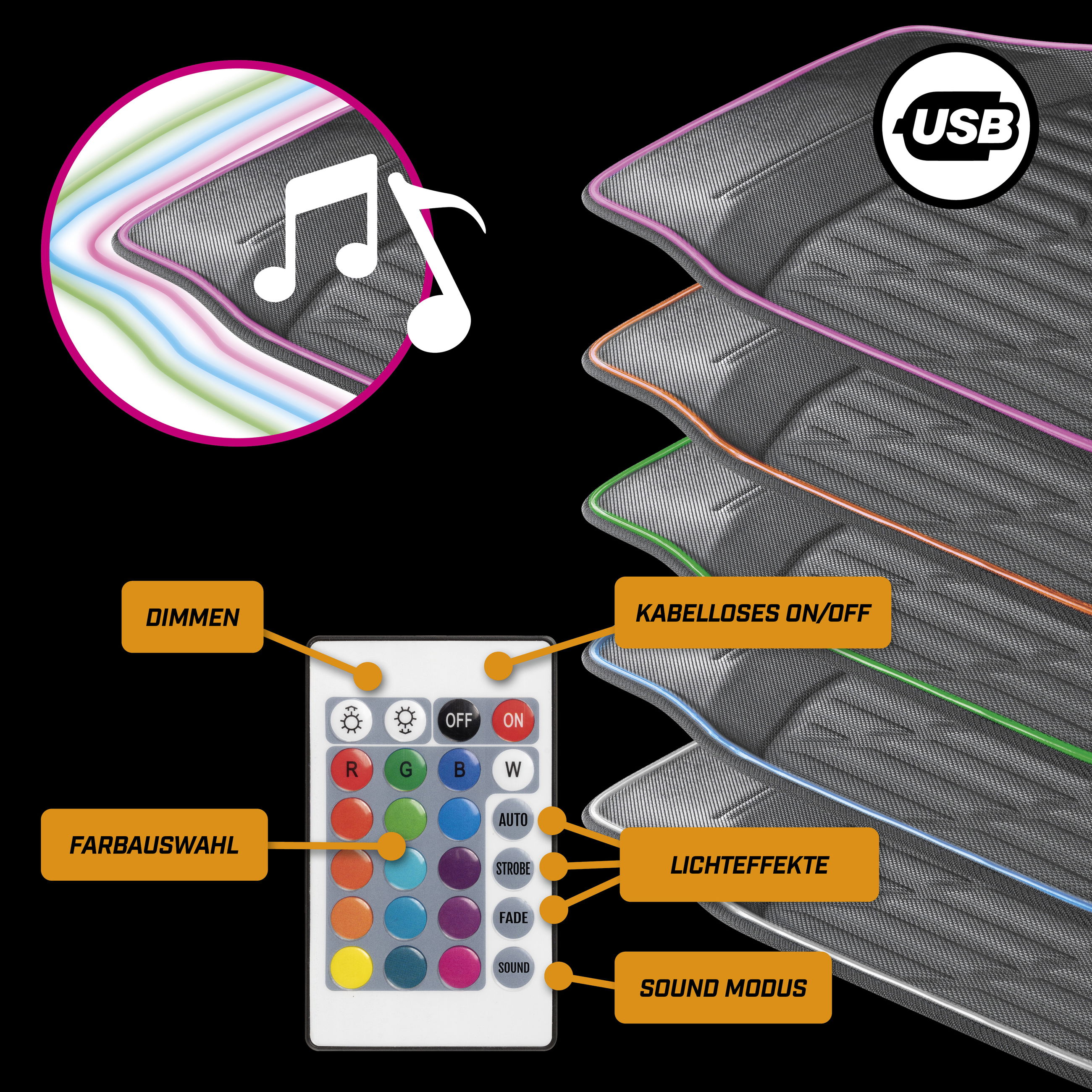 Die innovative Matte Glow für Fahrer und Beifahrer ist jeweils mit einem LED Kederband ausgestattet. Die Matten sind in der Mitte mit einem Kabel über einen USB Stecker mit dem Auto verbunden werden. Über einen Knopf am USB Stecker wird das LED Band eingeschaltet und anschließend können Sie Farben über eine Infrarotfernbedienung beliebig auswählen und wechseln. Das Highlight von Glow ist der Musik Modus, bei dem die LED's im Takt der Musik blinken. Zusätzlich haben Sie mehrere Lichtfunktionen, die ebenfalls über die Fernbedienung immer für Fahrer und Beifahrer eingestellt werden können.